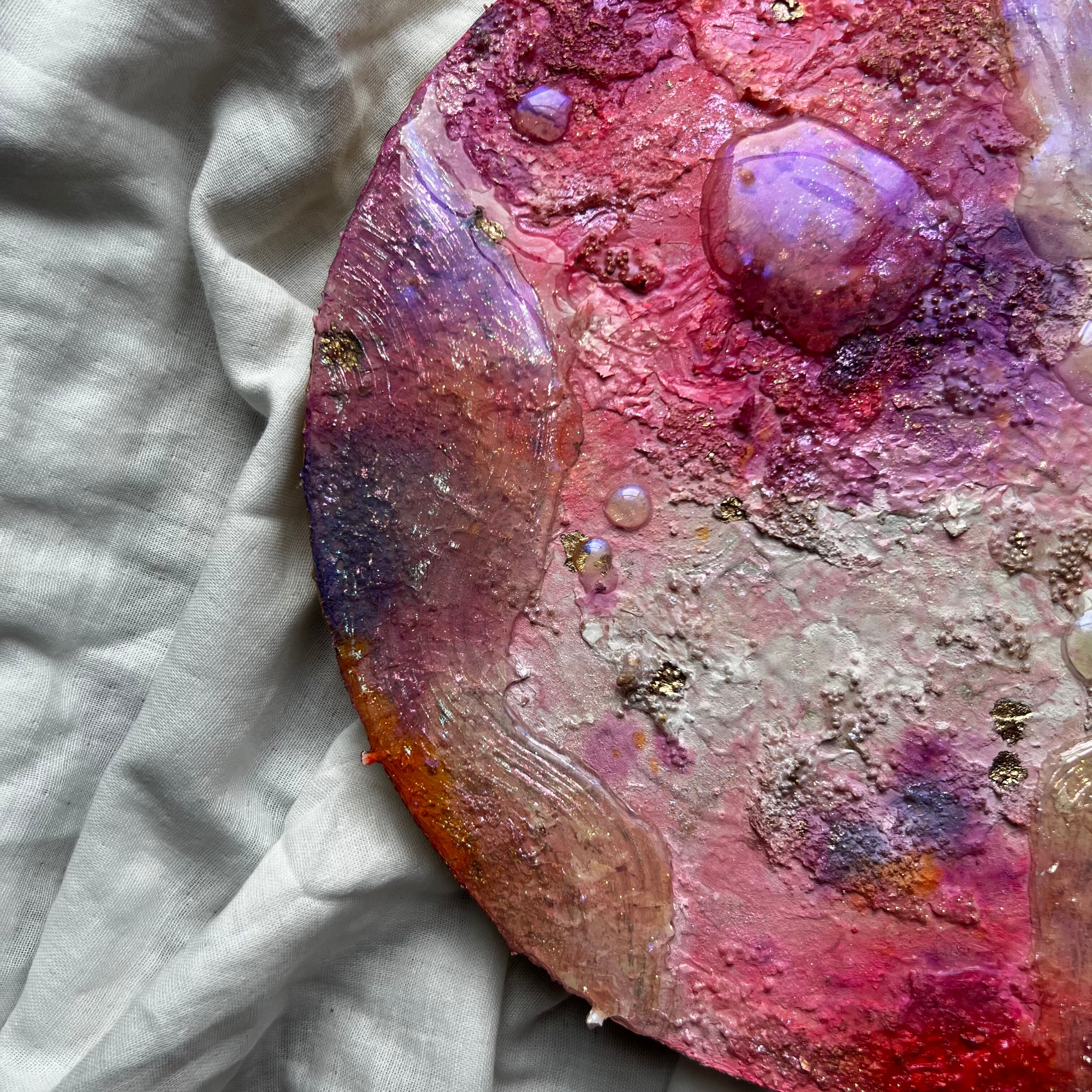 優しい凹凸のあるテクスチャーと、偏光パールの絵の具、艶のあるレジン、様々な角度からお楽しみください。