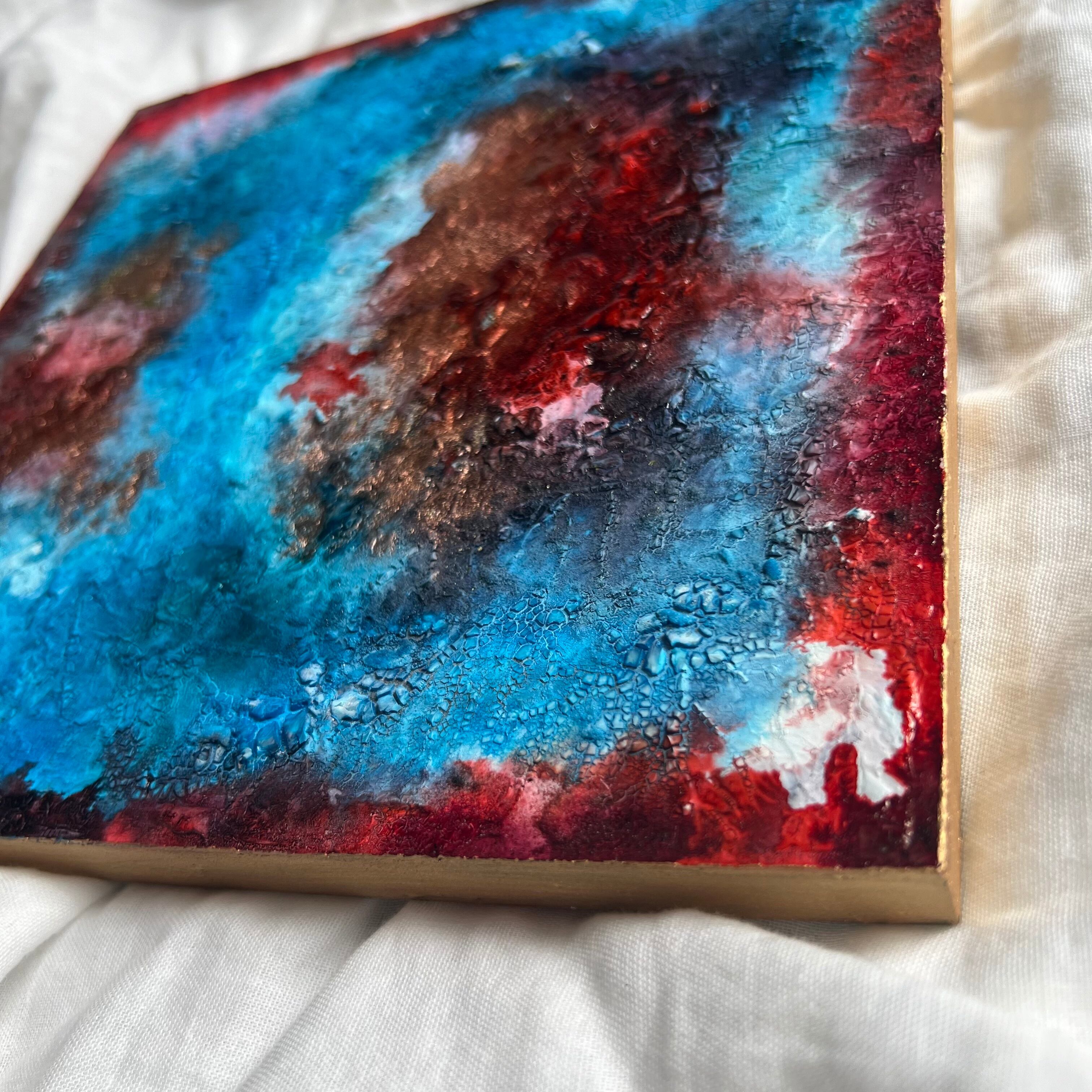 穏やかなスカイブルーをじわじわと燃やしていく強い赤がアクセントカラー。