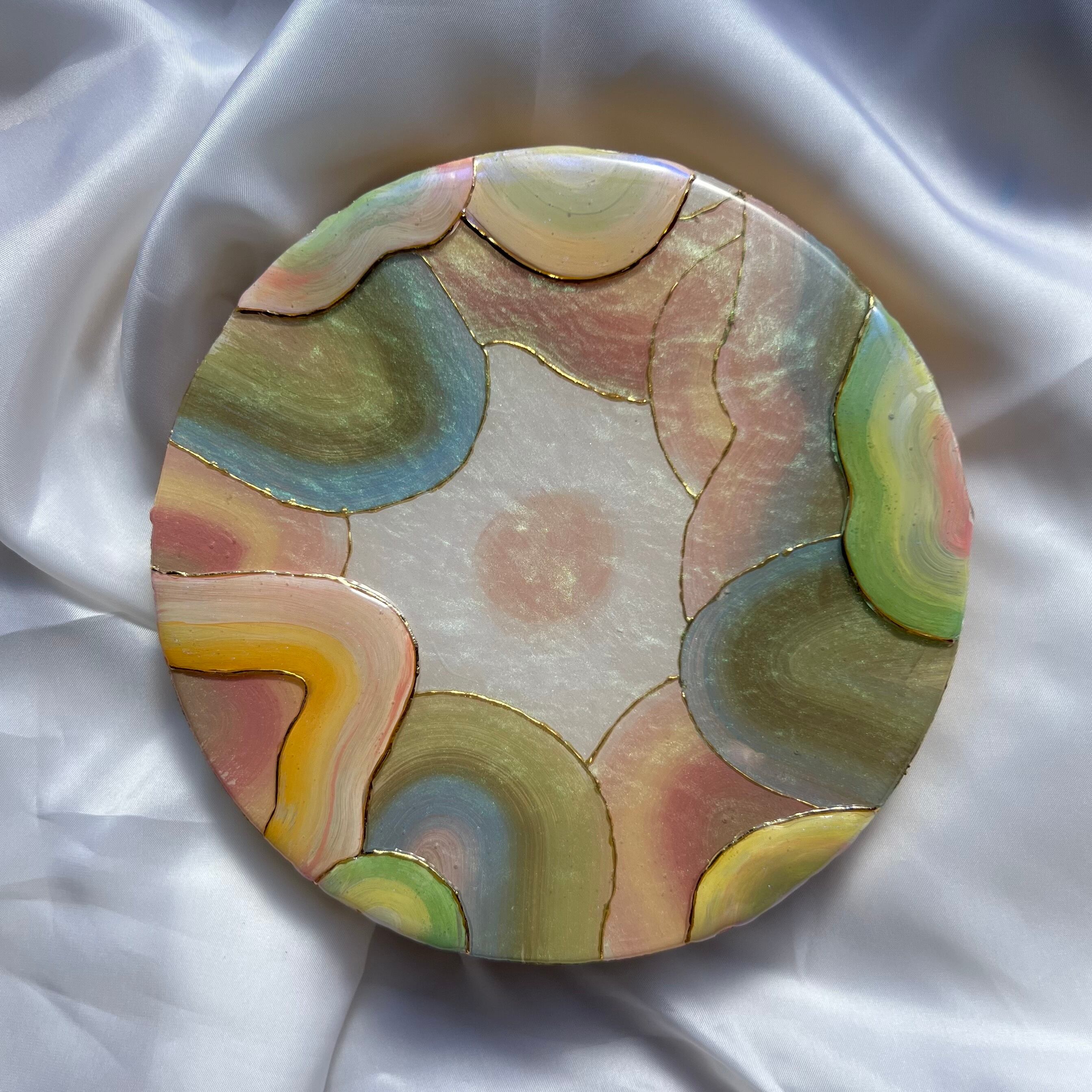 優しいピンクと、カーキ、オレンジイエロー、ブルーをミックスさせた作品。