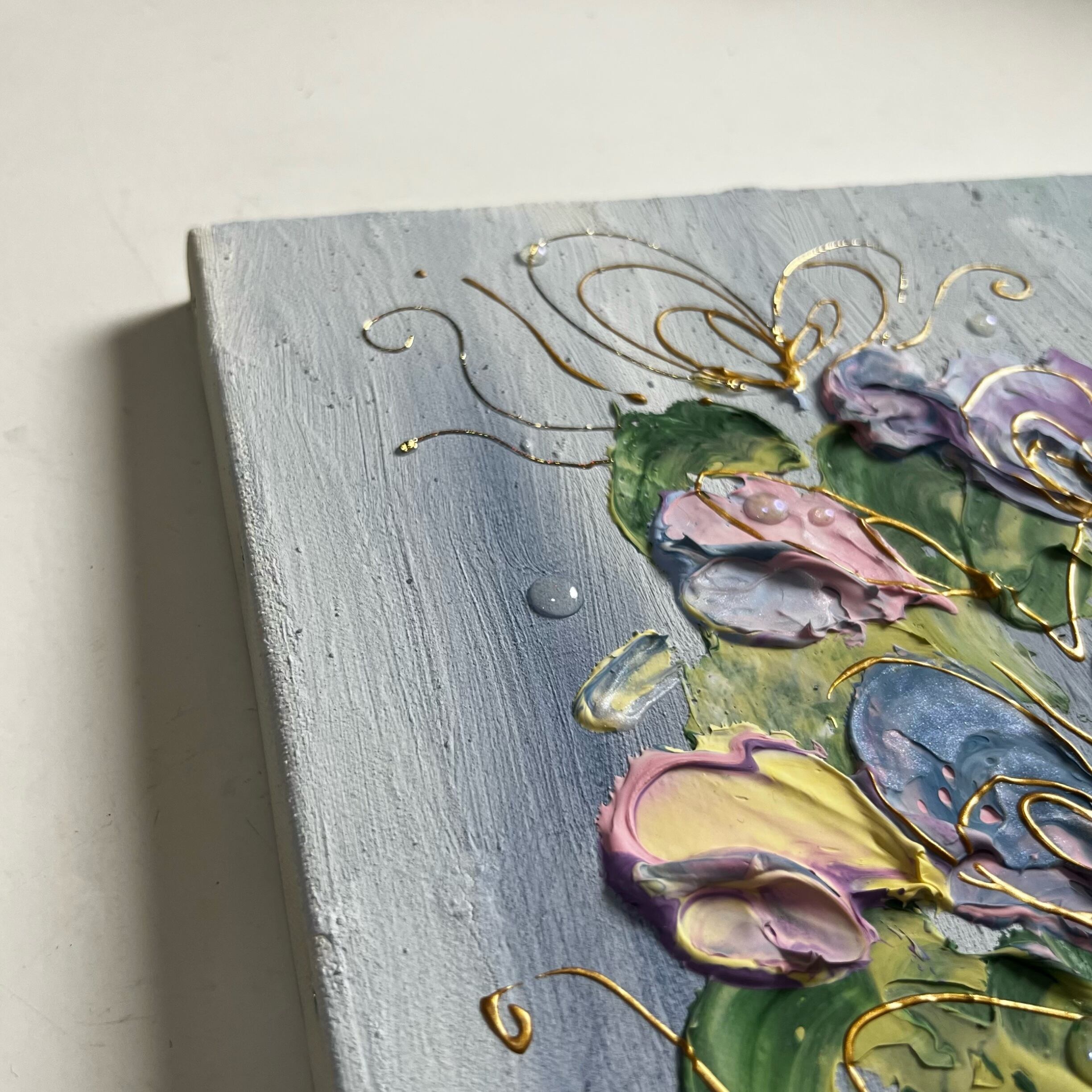 凹凸のあるテクスチャーと、偏光パールの絵の具、艶のあるレジン、にアクセントのゴールドを使用し春にぴったりの作品です。