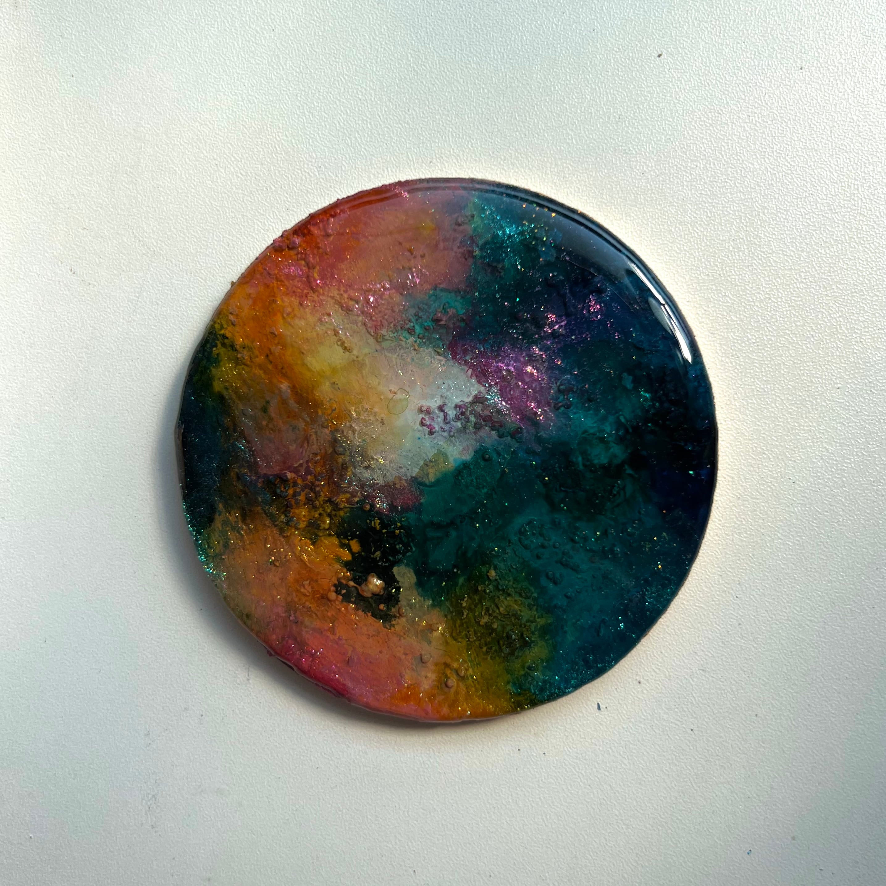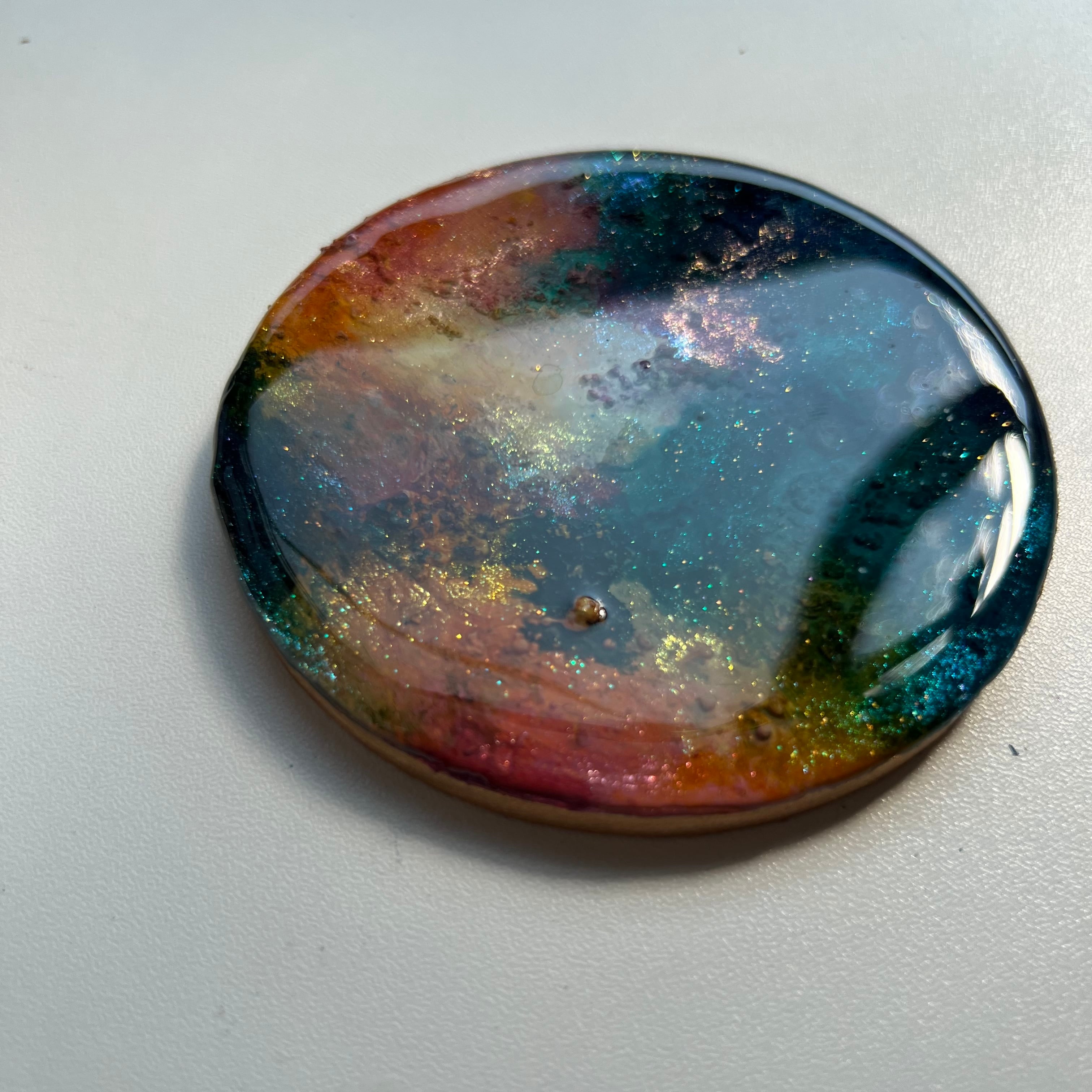 レジンとラメを上から重ねて、奥行きが出るように仕上げております。太陽光にかざすと密かにキラキラと輝く作品です。