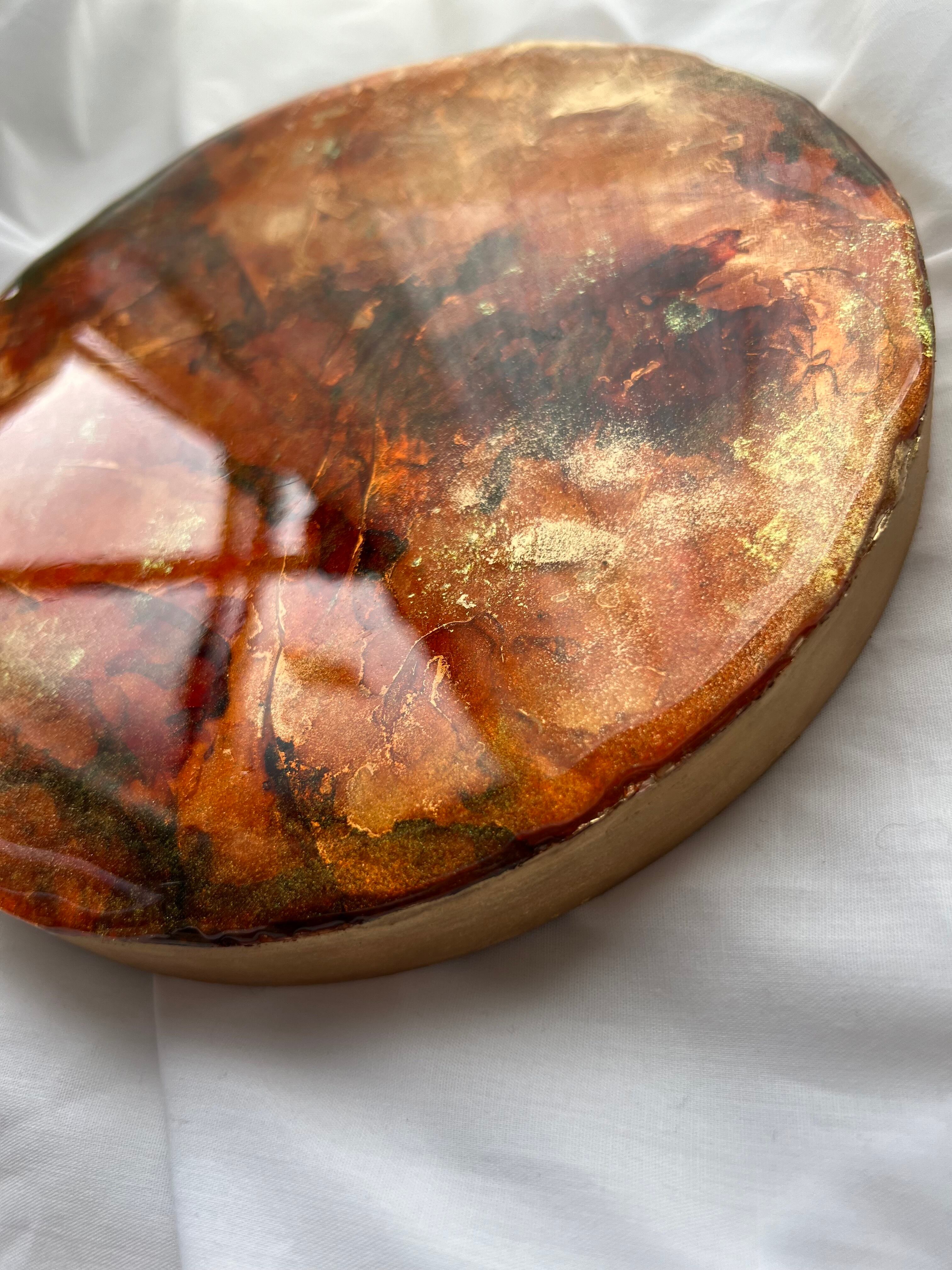 ゴールドで着色されたジェルメディウムに、二液性レジンを重ねる。