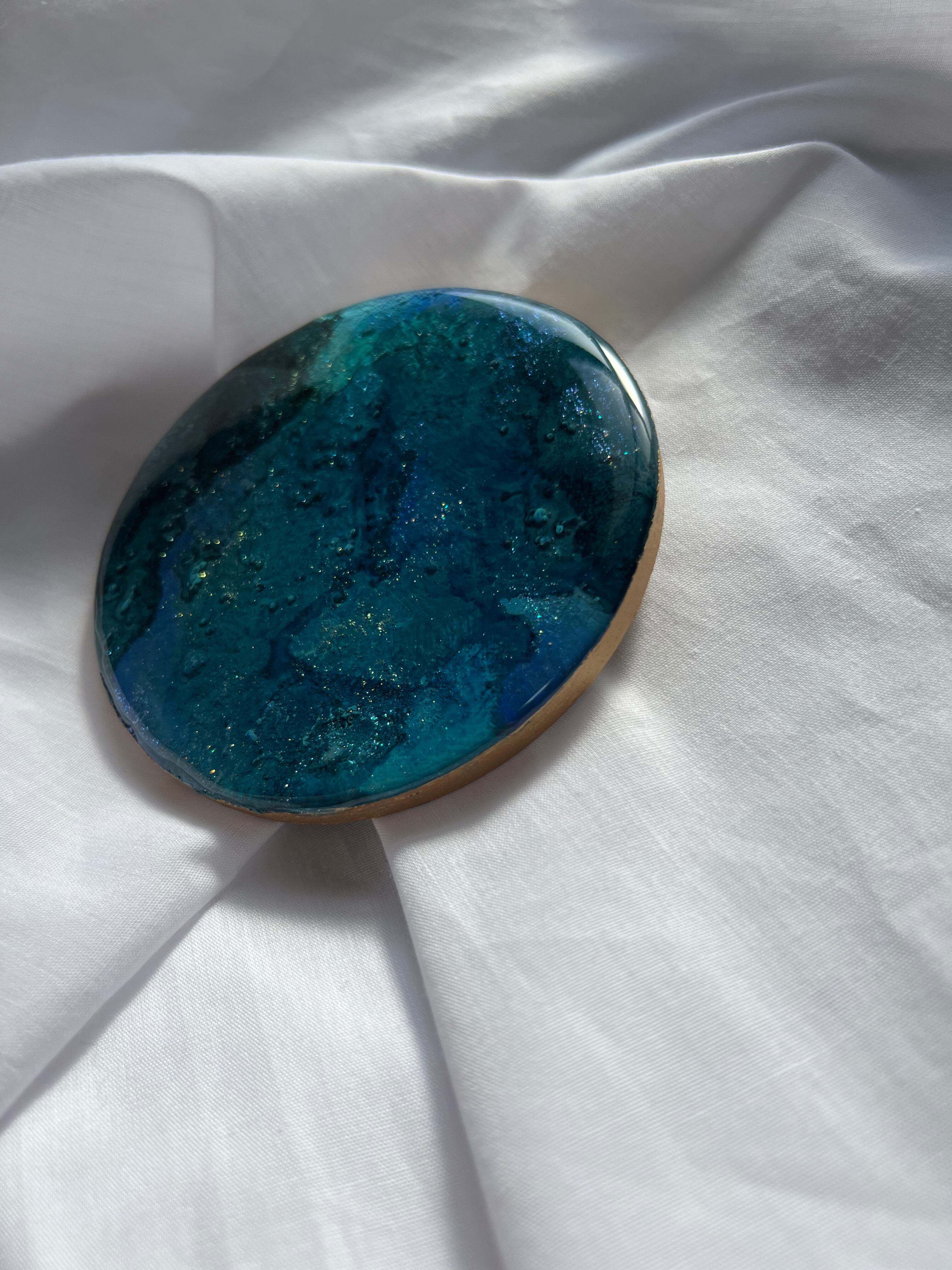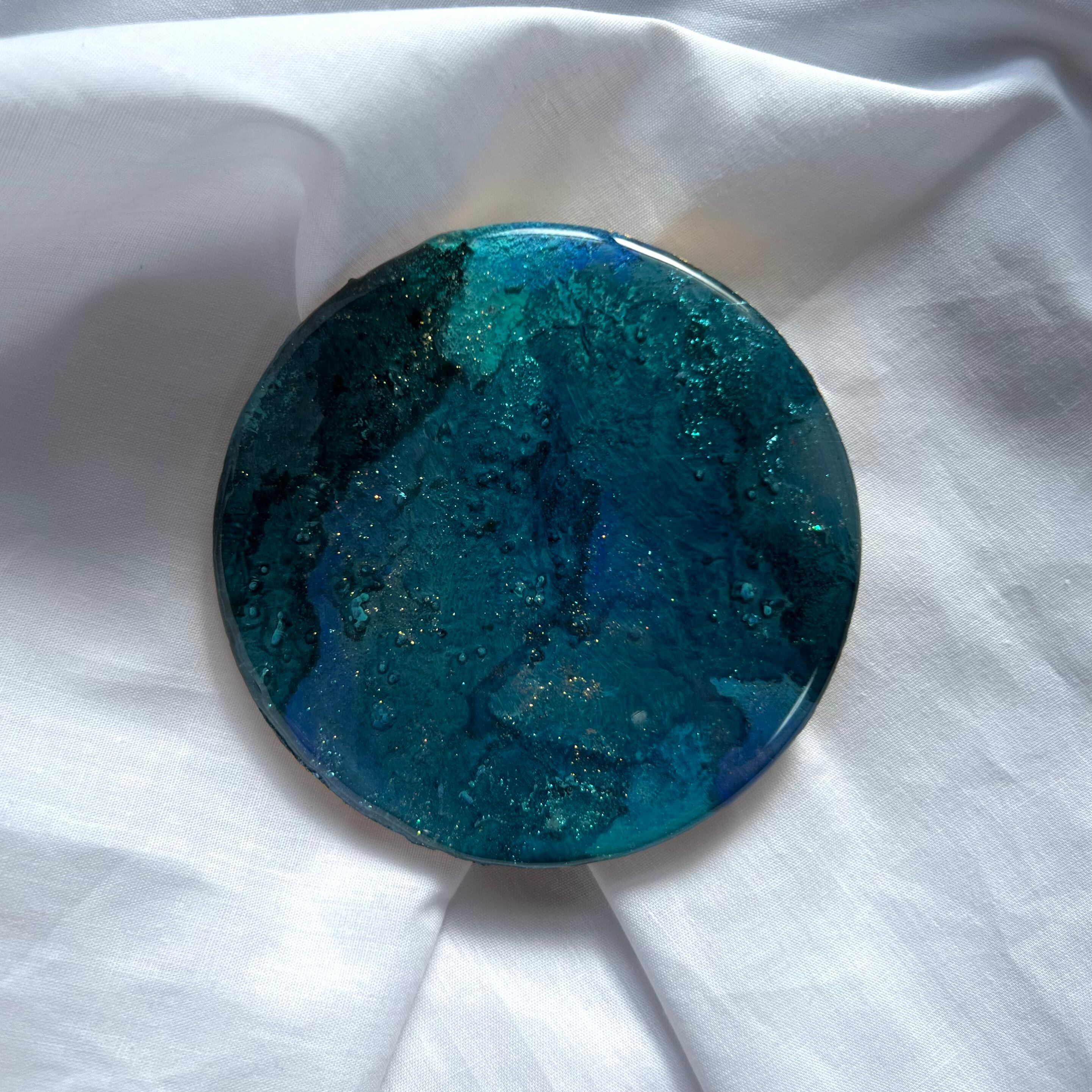 レジンとラメを上から重ねて、奥行きが出るように仕上げております。太陽光にかざすと密かにキラキラと輝く作品です。